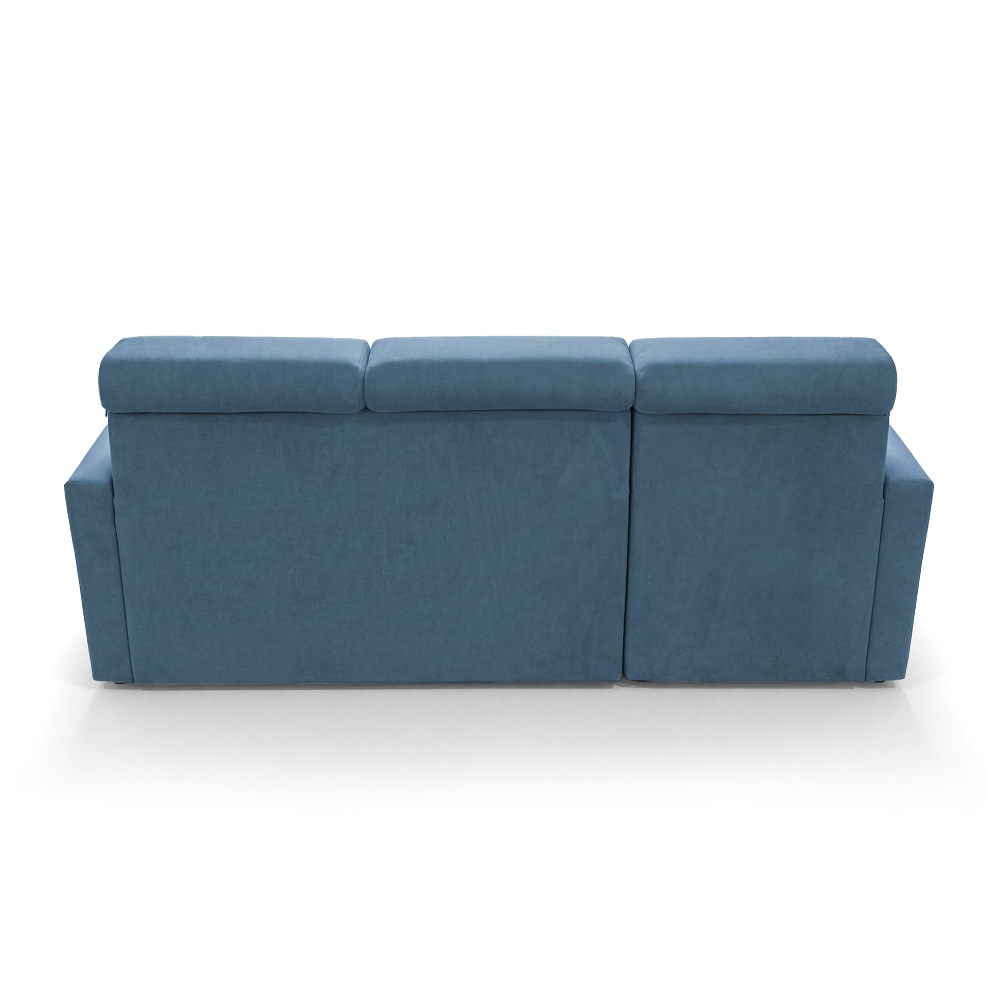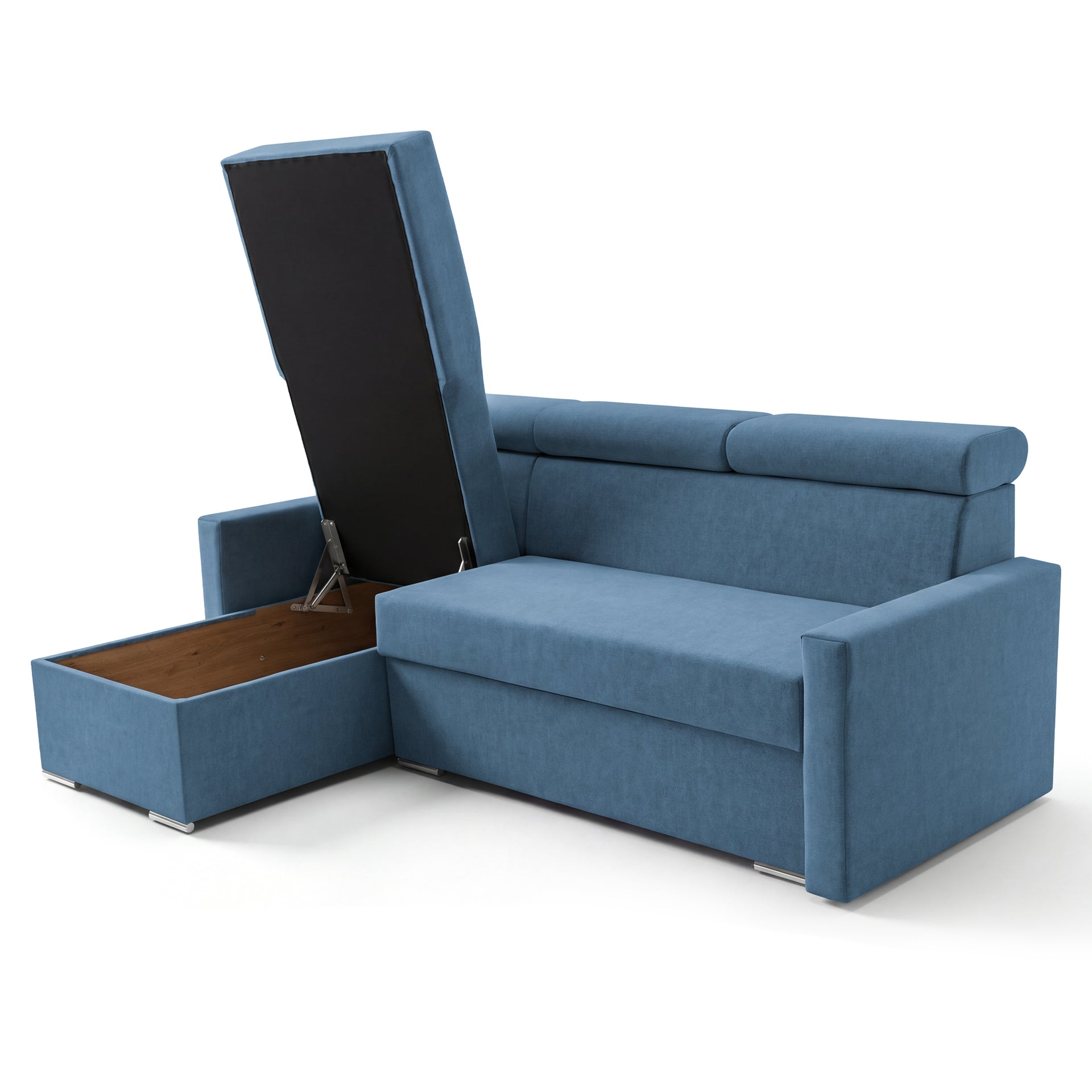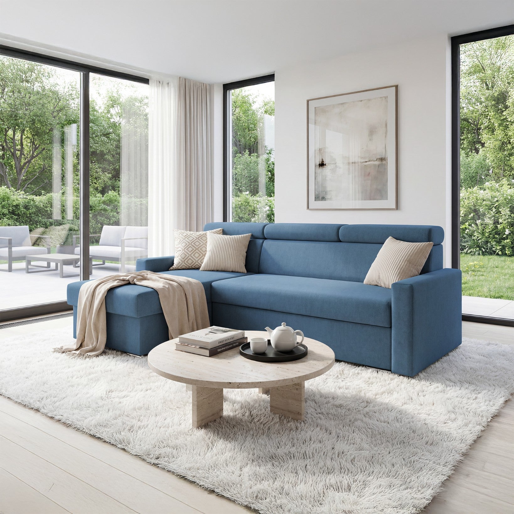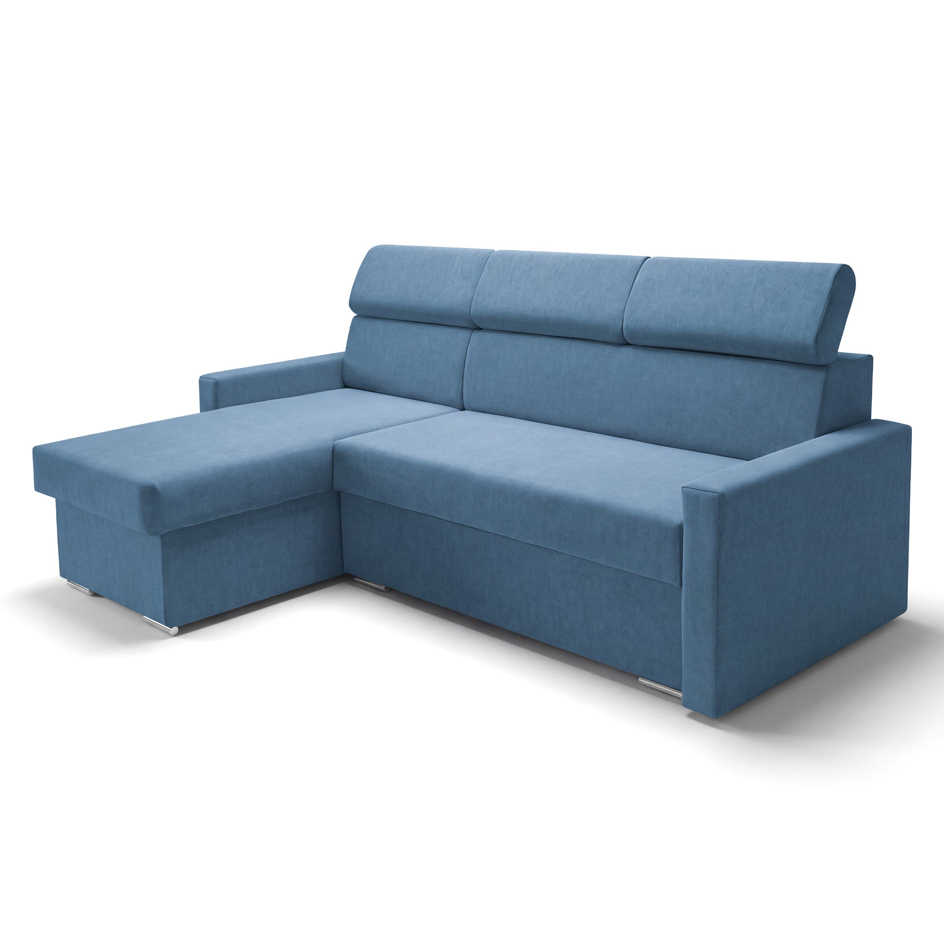 SOFILAND Narożnik Vega L z funkcją spania i pojemnikiem na pościel – szerokość regulowana indywidualnie do +20 cm – konstrukcja przylegająca do ściany – wolnostojący – tkanina aksamitna Best – przyjazny dla zwierząt (niebieski)