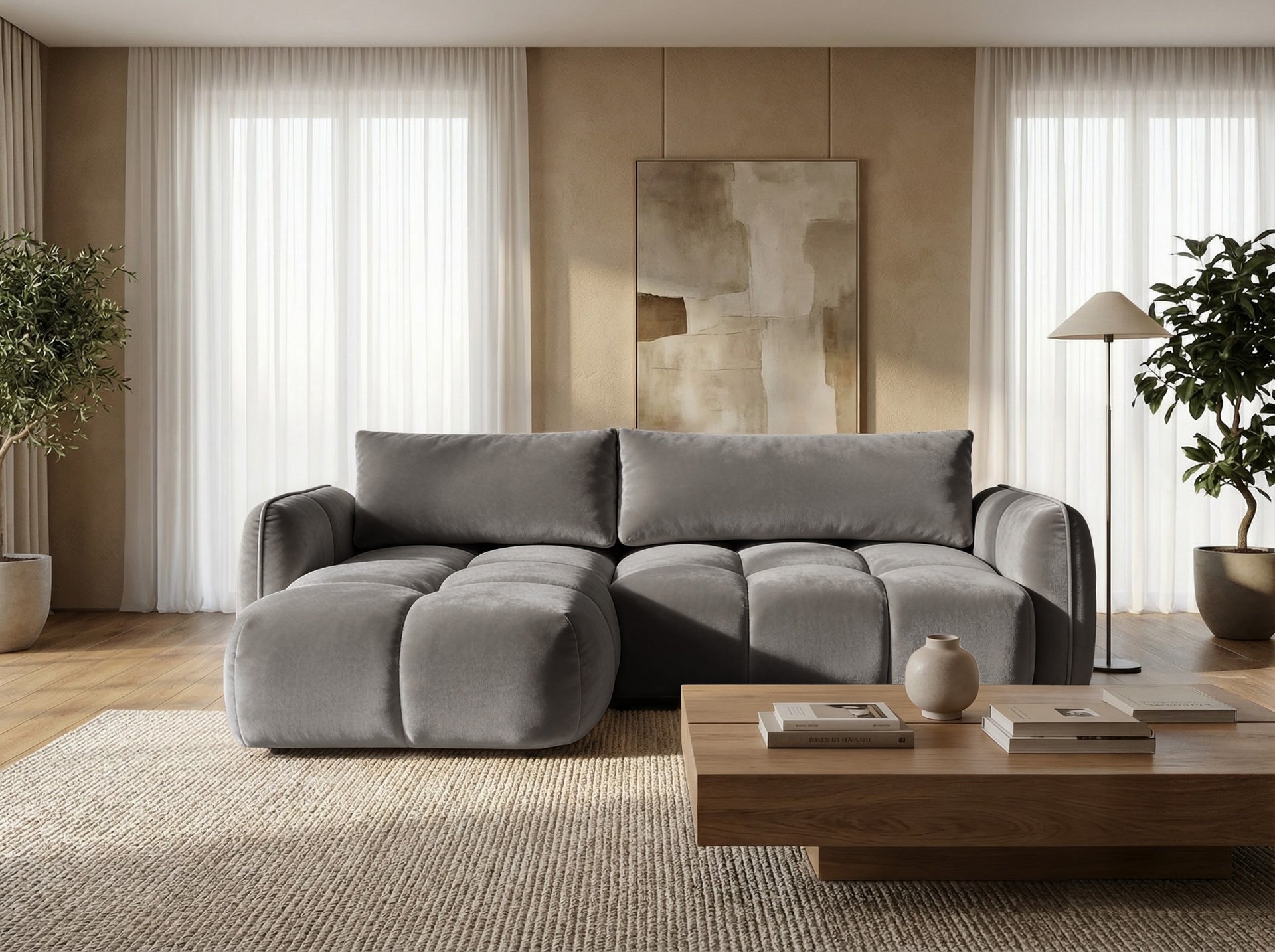 Ecksofa BELVEO mit Schlaffunktion und Bettkasten L-Form Sofa Recamiere Samt-Optik Bluvel 06  PREMIUM KOMFORT: Die Kombination aus T3038-Schaum und hochelastischem HR3020-Schaum im Sitz und Rücken bietet eine punktgenaue Unterstützung und verhindert dauerhafte Verformungen. SAMTIGE HAPTIK: Der Bluvel-Bezug besticht durch seine extrem weiche Oberfläche und einen eleganten Glanz, der bei Lichteinfall...