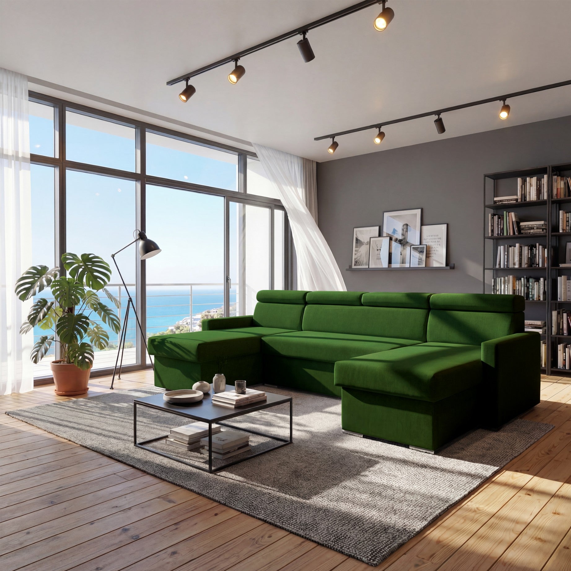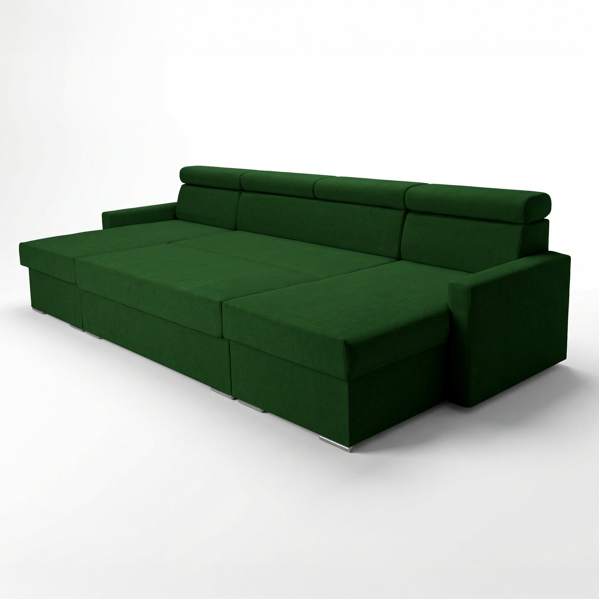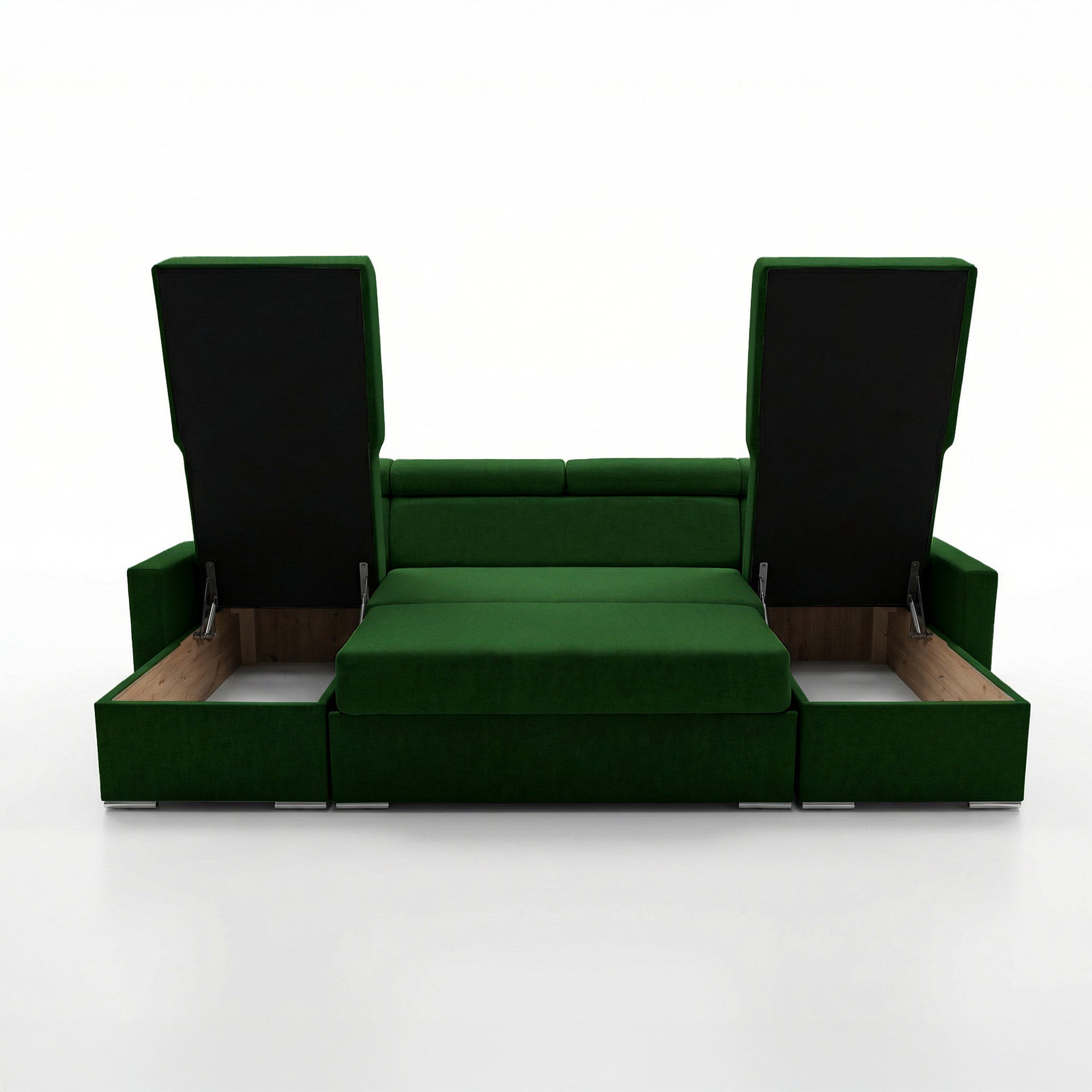 Narożnik Vega U na wymiar | Regulowana szerokość | Funkcja spania 2 schowki na pościel Kształt litery U Regulowane zagłówki Aksamitna tkanina Best 305 x 151 cm (kolor butelkowa zieleń)