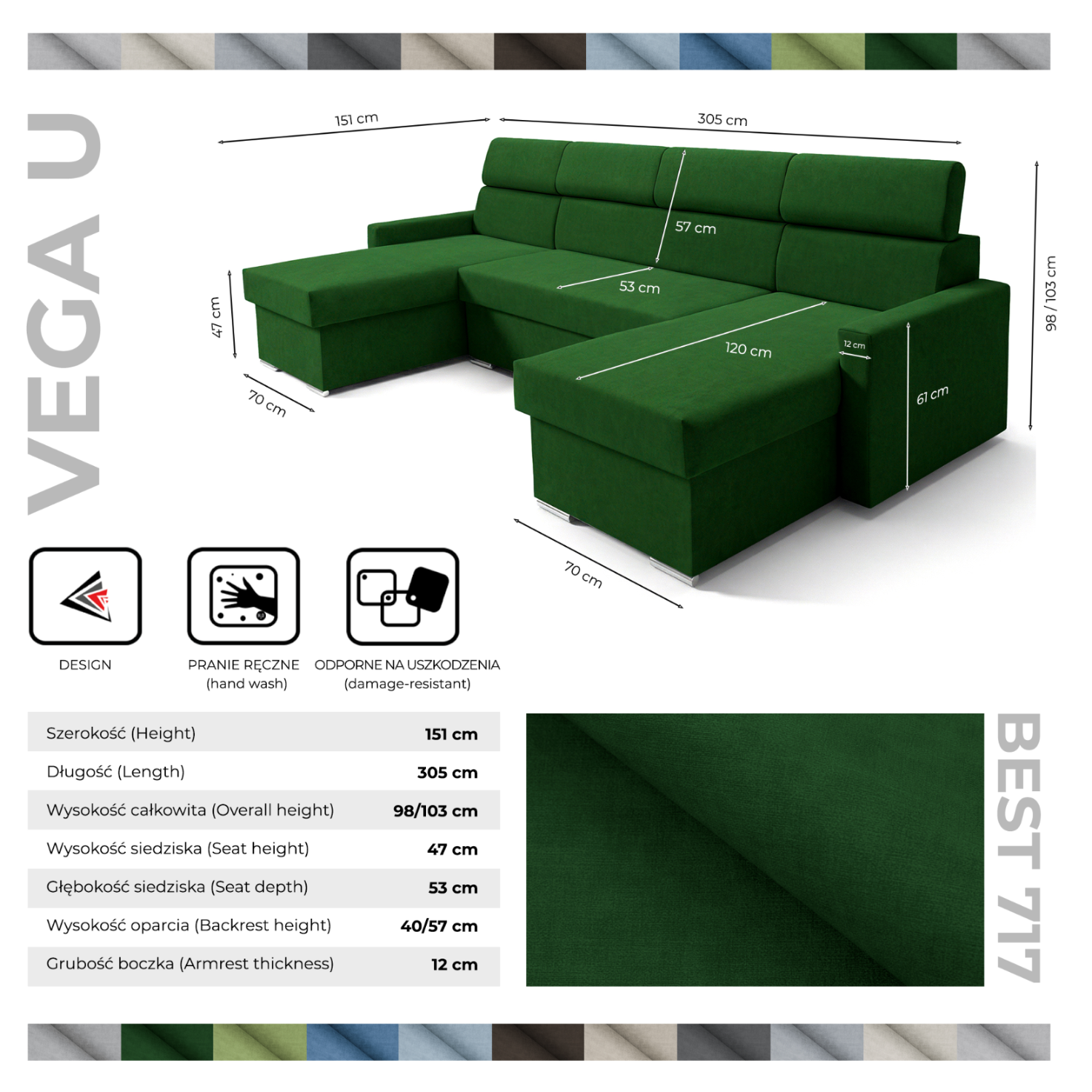 Zmień swój salon w oazę spokojuWyobraź sobie, jak po długim dniu pracy zapadasz się w miękkie poduszki zestawu wypoczynkowego VEGA U. Wysokiej jakości aksamitna tkanina „Best” otula Cię swoją jedwabistą powierzchnią, a obszerny kształt litery U zapewnia wystarczająco dużo miejsca dla całej rodziny. Niezależnie od tego, czy chcesz spędzić wieczór...