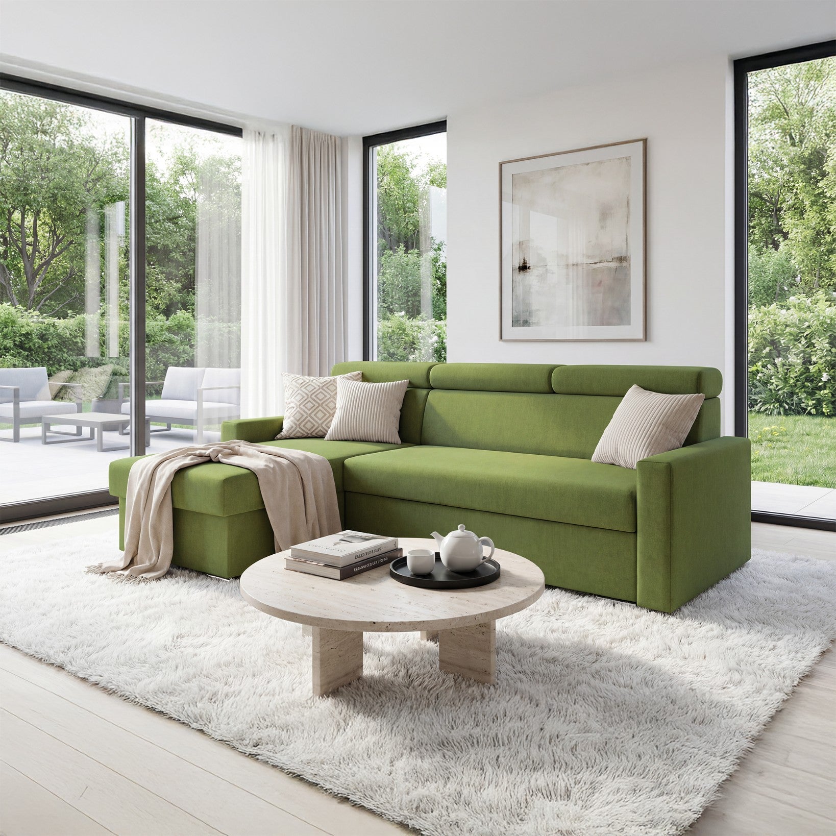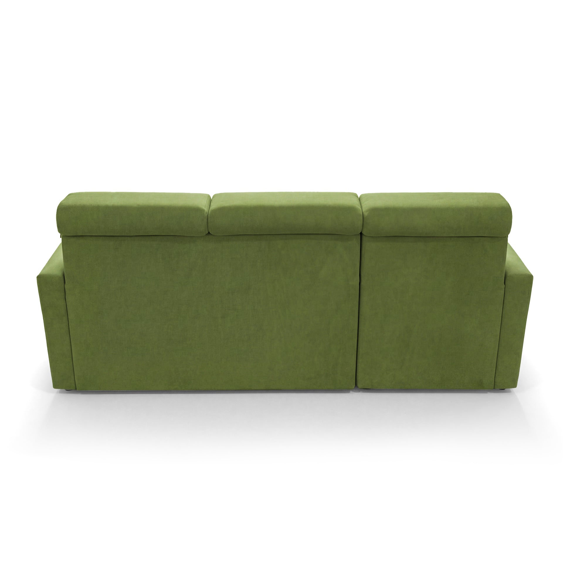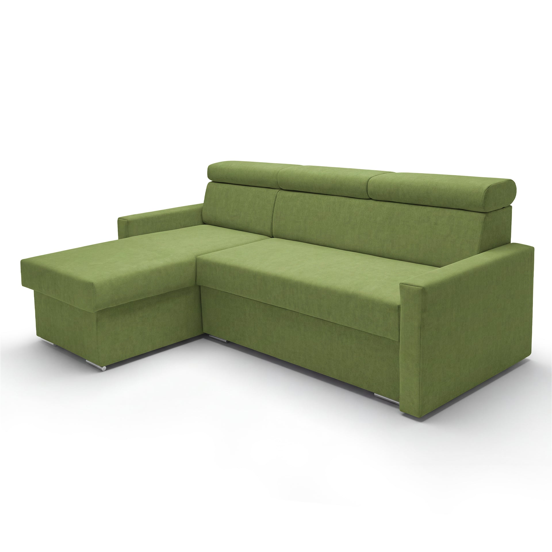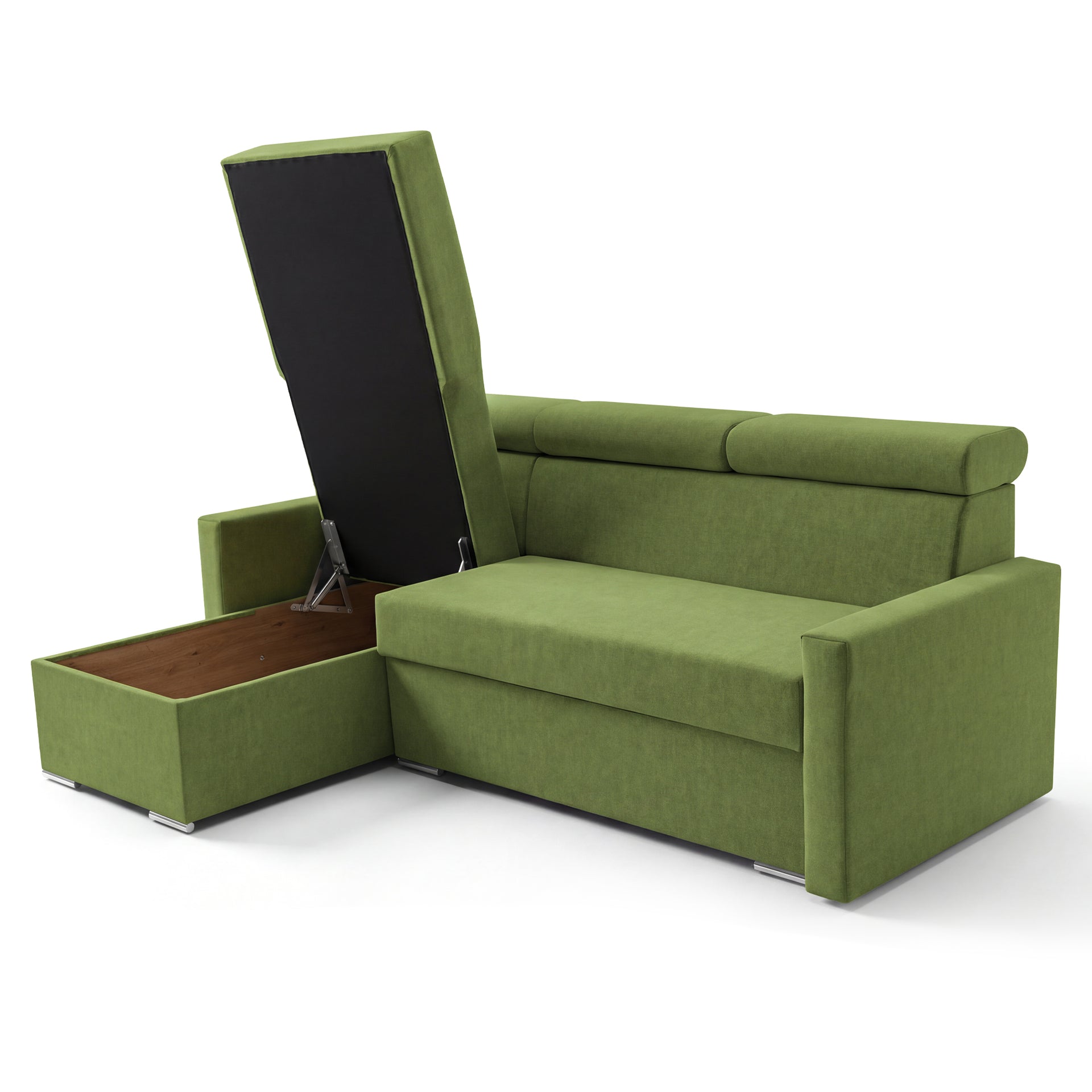 SOFILAND Narożnik Vega L z funkcją spania i pojemnikiem na pościel – szerokość regulowana indywidualnie do +20 cm – konstrukcja przylegająca do ściany – wolnostojący – tkanina aksamitna Best – przyjazny dla zwierząt (zielony)