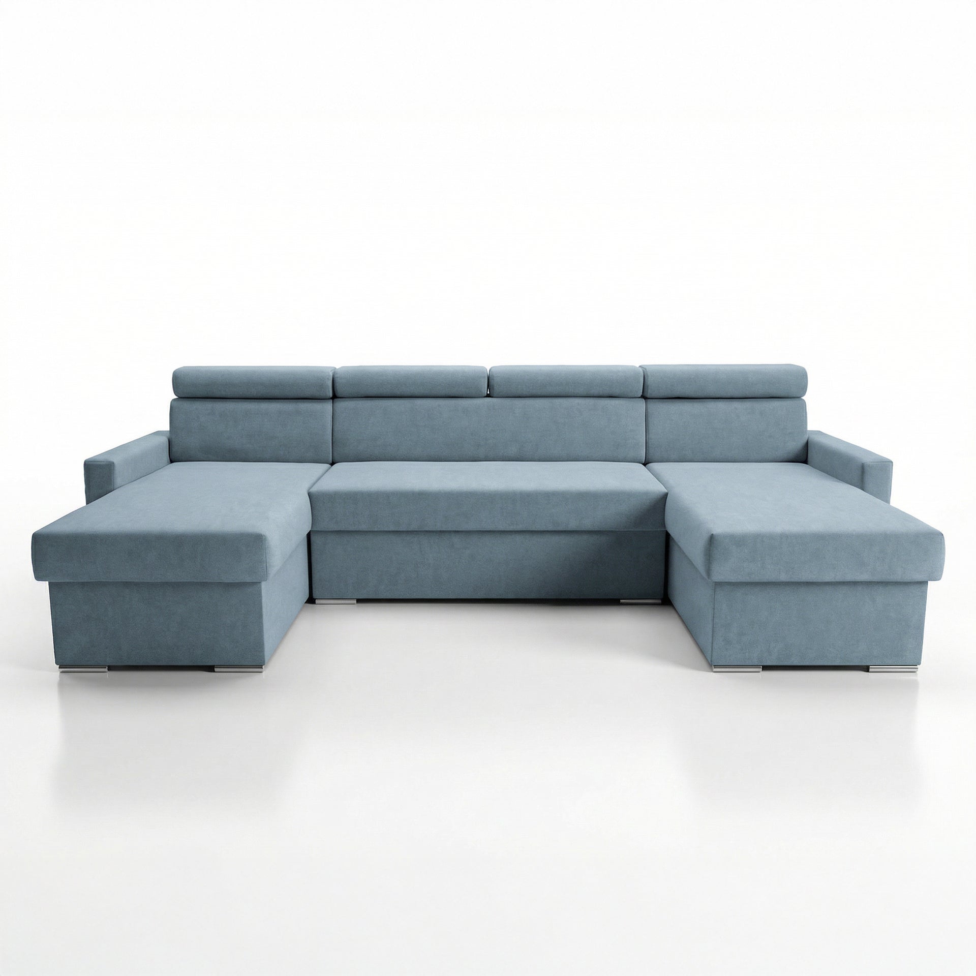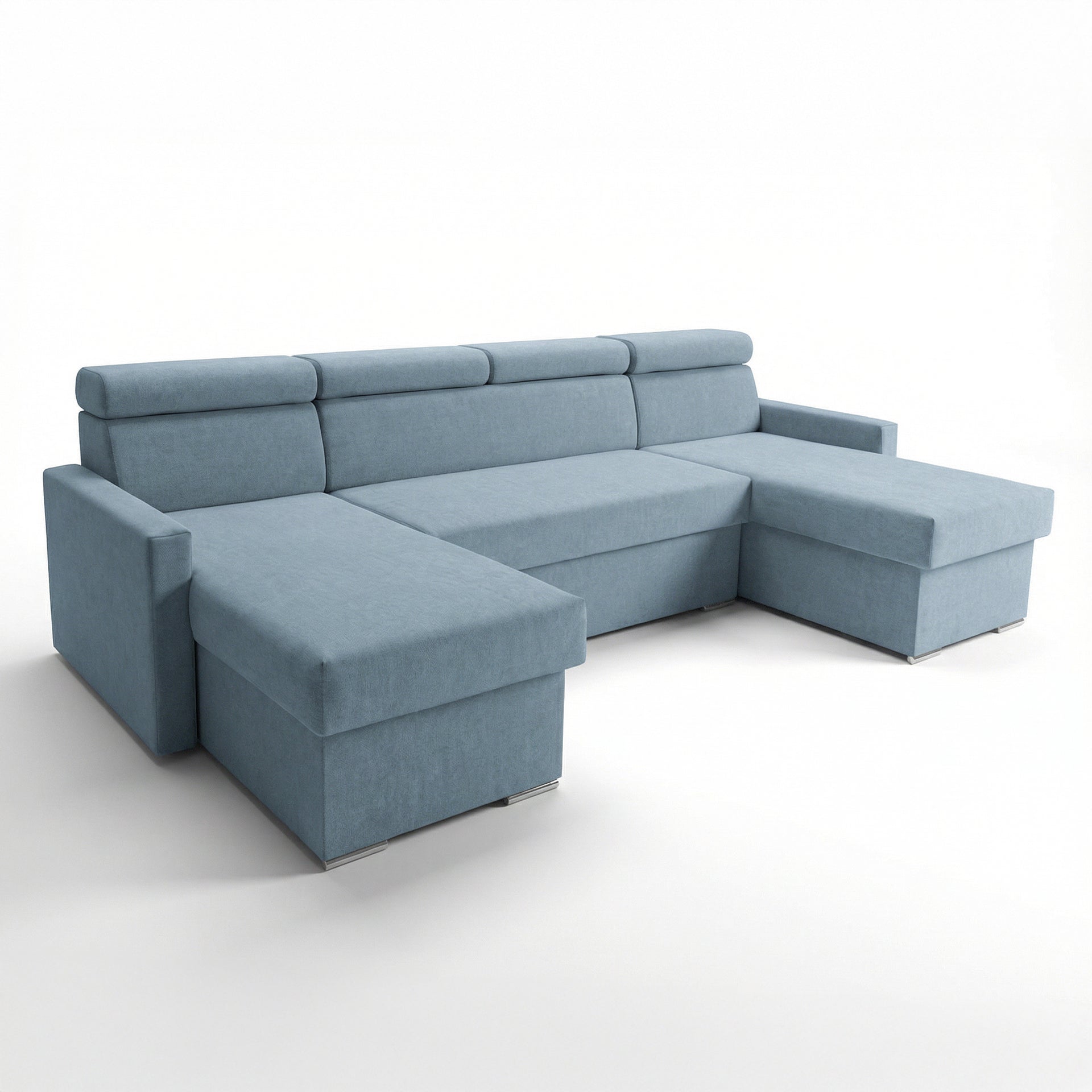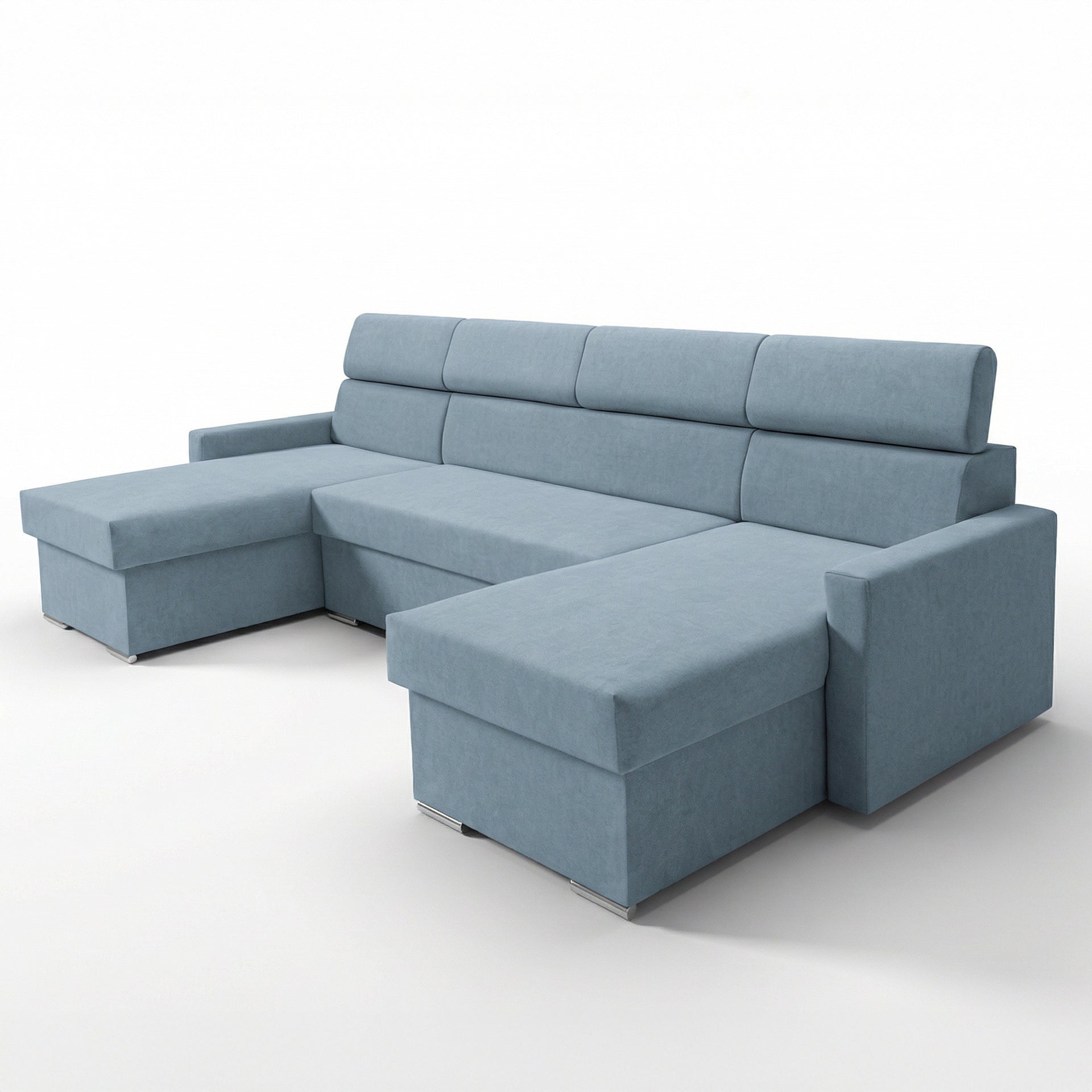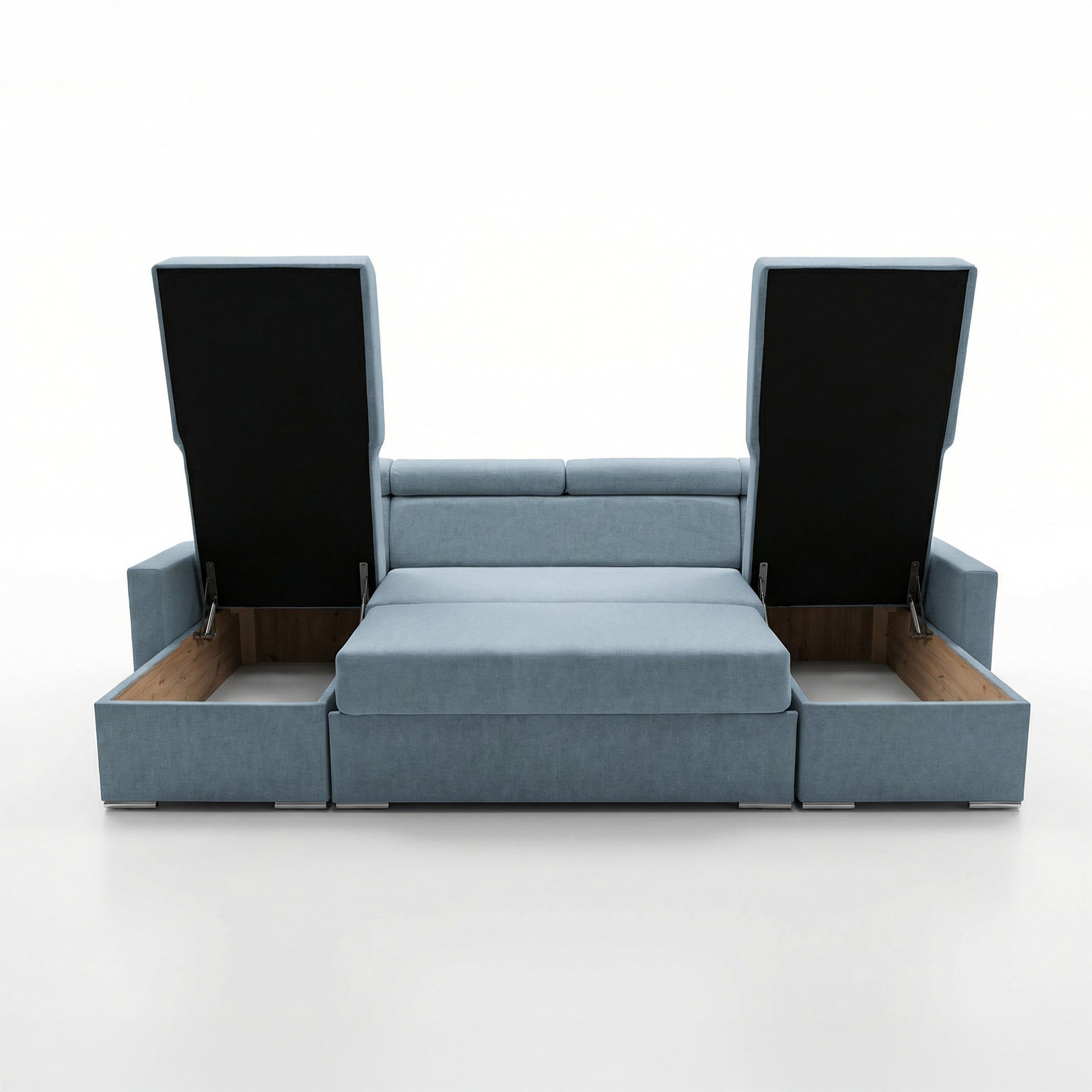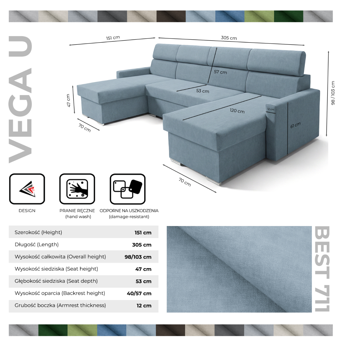 Vega U Zestaw wypoczynkowy z funkcją spania i 2 schowkami na pościel Narożnik w kształcie litery U Regulowane zagłówki Aksamitna tkanina Best 305x151 cm (711)
