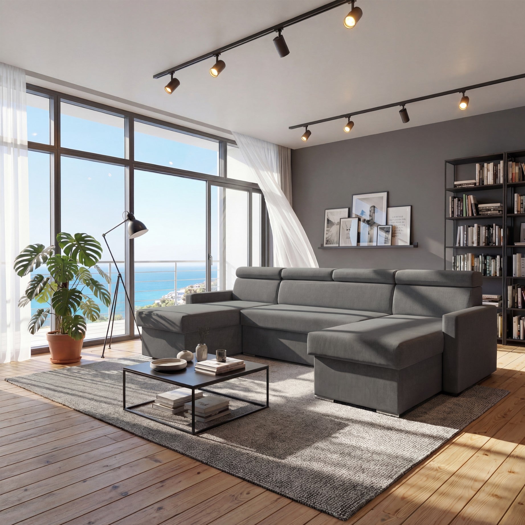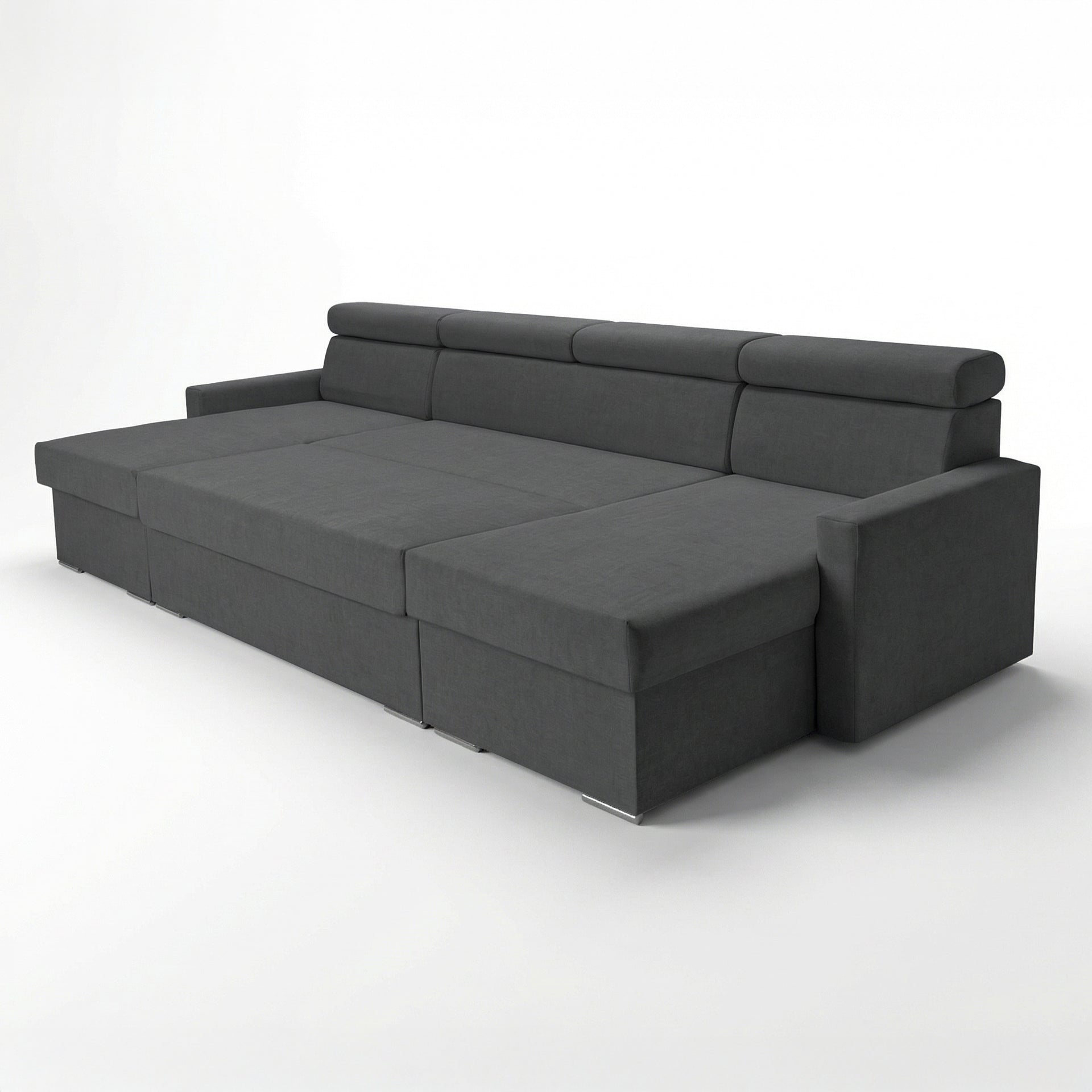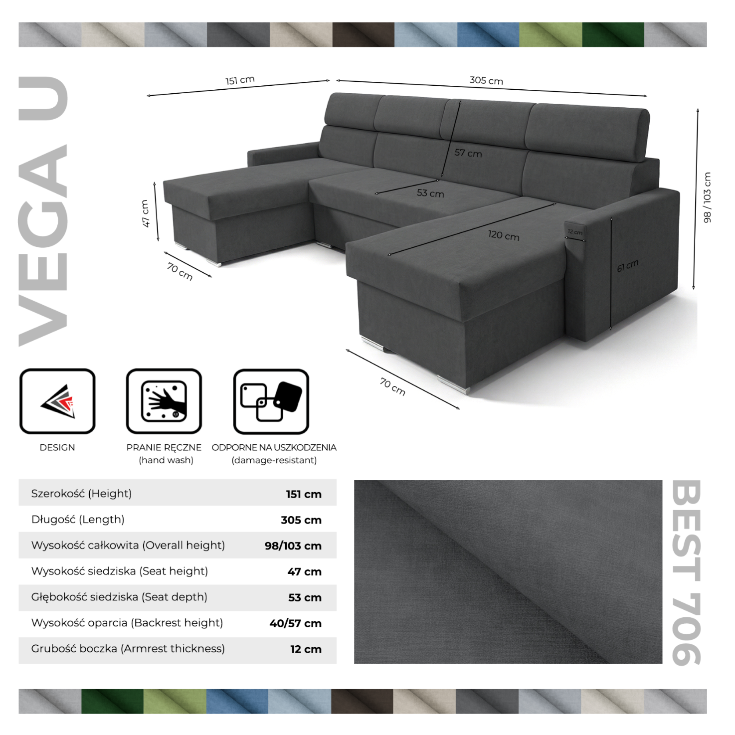 Vega U Zestaw wypoczynkowy z funkcją spania i 2 schowkami na pościel Narożnik w kształcie litery U Regulowane zagłówki Aksamitna tkanina Best 305x151 cm (grafit)
